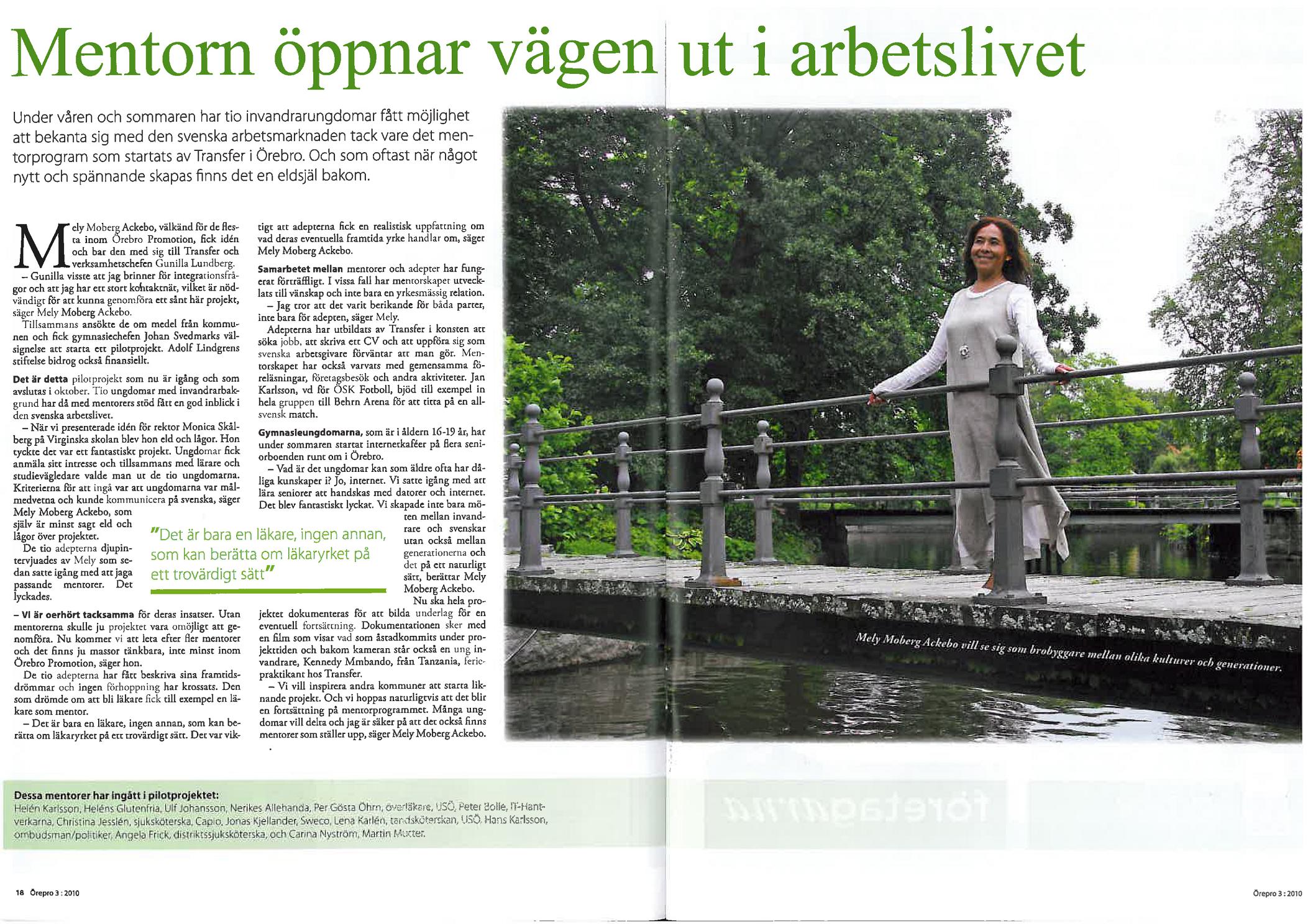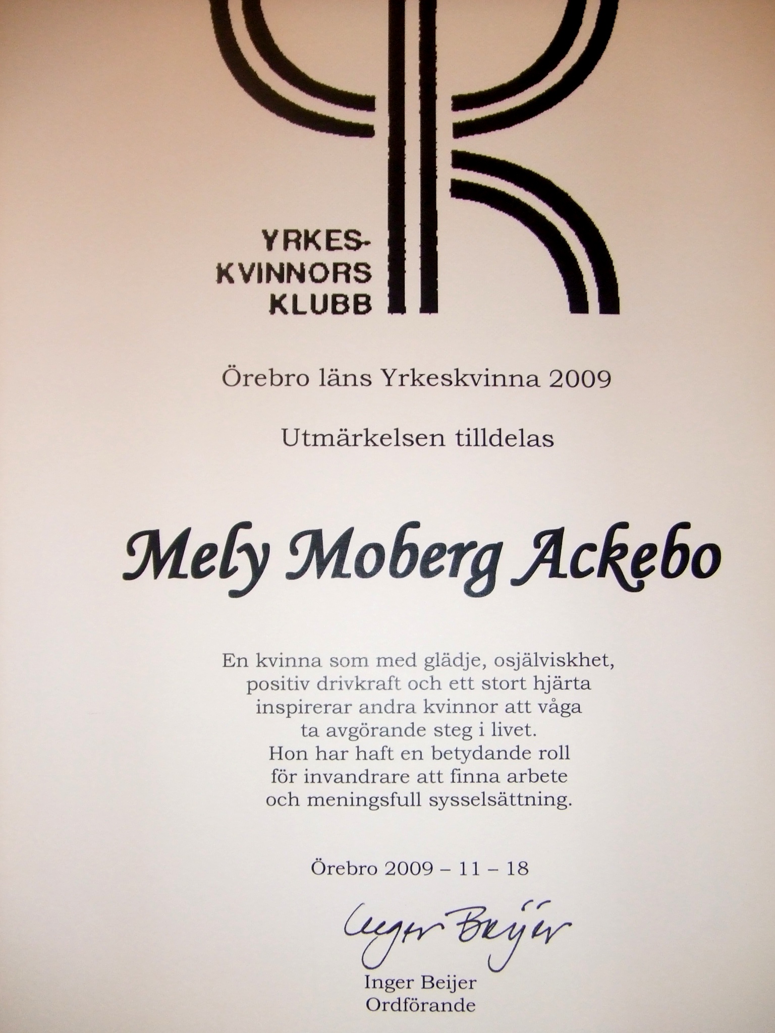 Press Utmärkelser Nationell Kommitté Sverige Läs mer Örebro läns Yrkeskvinna 2009 Läs mer Paul Harris Fellow by The Rotary Club Läs mer Pressyn En resa i bilder och dansa genom intressant kultur PERU... Ett land som har mycket att erbjuda. Läs mer En festival för integration. Fredag 5 april kl 18-21. Läs mer Mentorn öppnar vägen ut i arbetslivet. Läs mer Mentorprogram 2010 Nerikes Allehanda. Läs mer När vi släpper rädslan, har vi allt att vinna: Årets yrkeskvinna om integration, jobb och mångfald. Läs mer Mentorer en väg till jobb: Tillsammans med Mely Moberg Ackebo, som utsågs till "Arets yrkeskvinna i Örebro 2009". Läs mer Rotary i Sverige: Mely Ackebo. Läs mer Året Runts reportage om Mely. Läs mer Bert Stålhammar, recension om Melys bok. Tror du tanterna kan cykla? Läs mer SVD - Balans i livet. Läs mer Mely Moberg Ackebo - Inkaprinsessans långa resa: Sveriges Radio. Läs mer